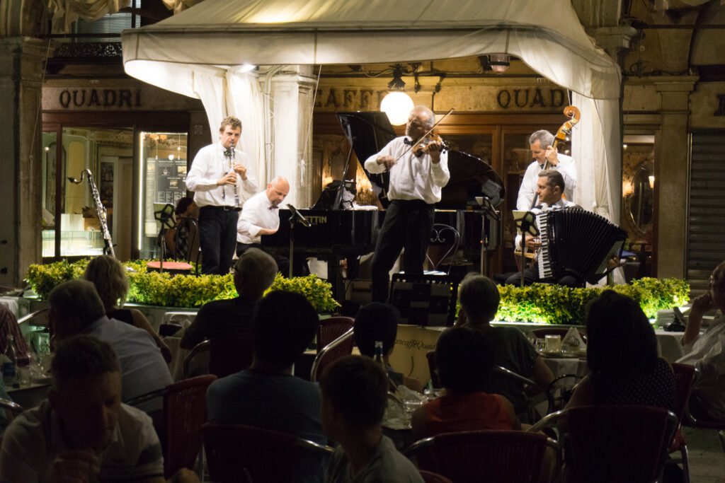 If you prefer to stay outside, the “dualling musicians” in St Marks Square are also very good.